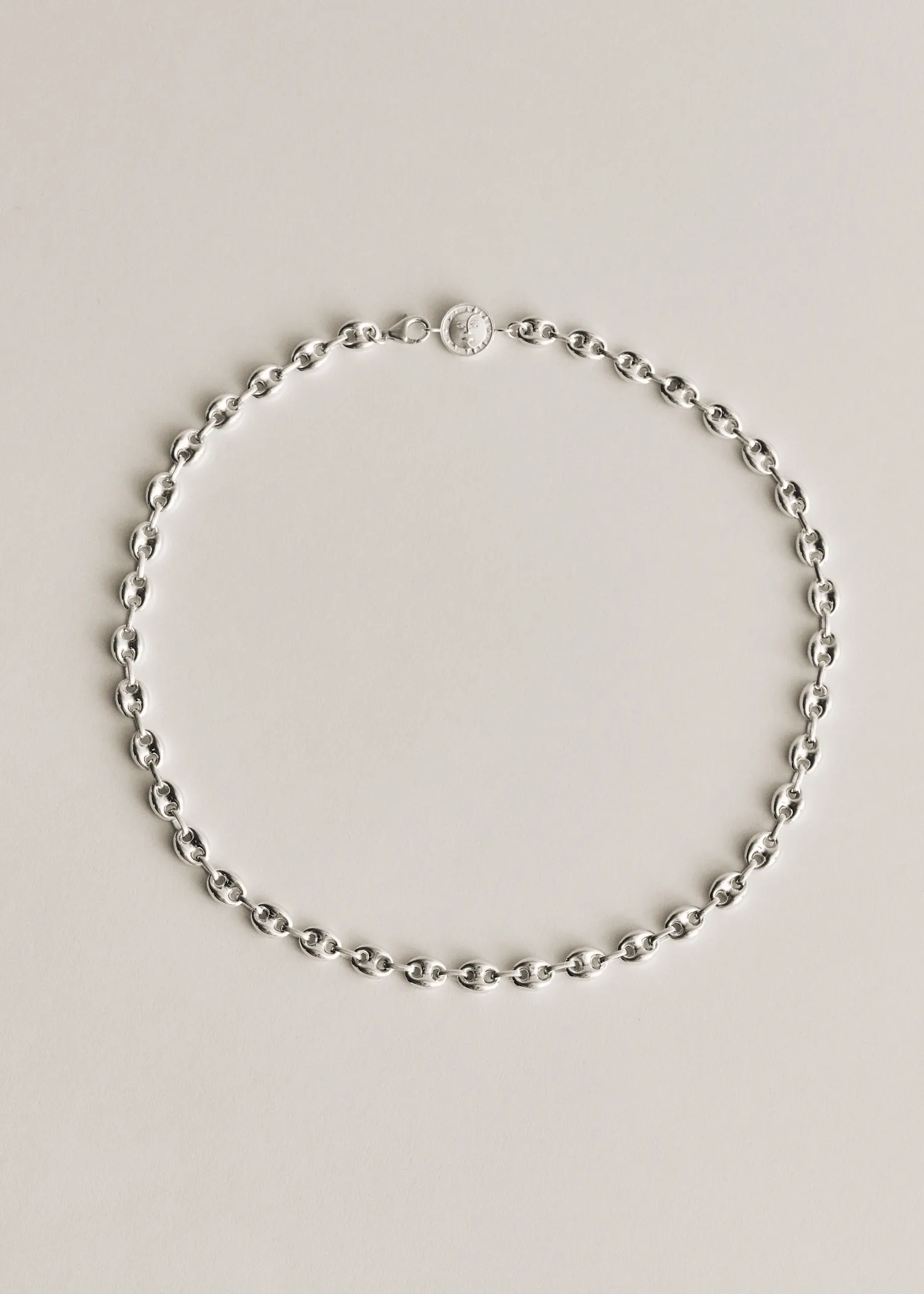 Faba Necklace, handmade from recycled sterling silver into a bean shaped profile.