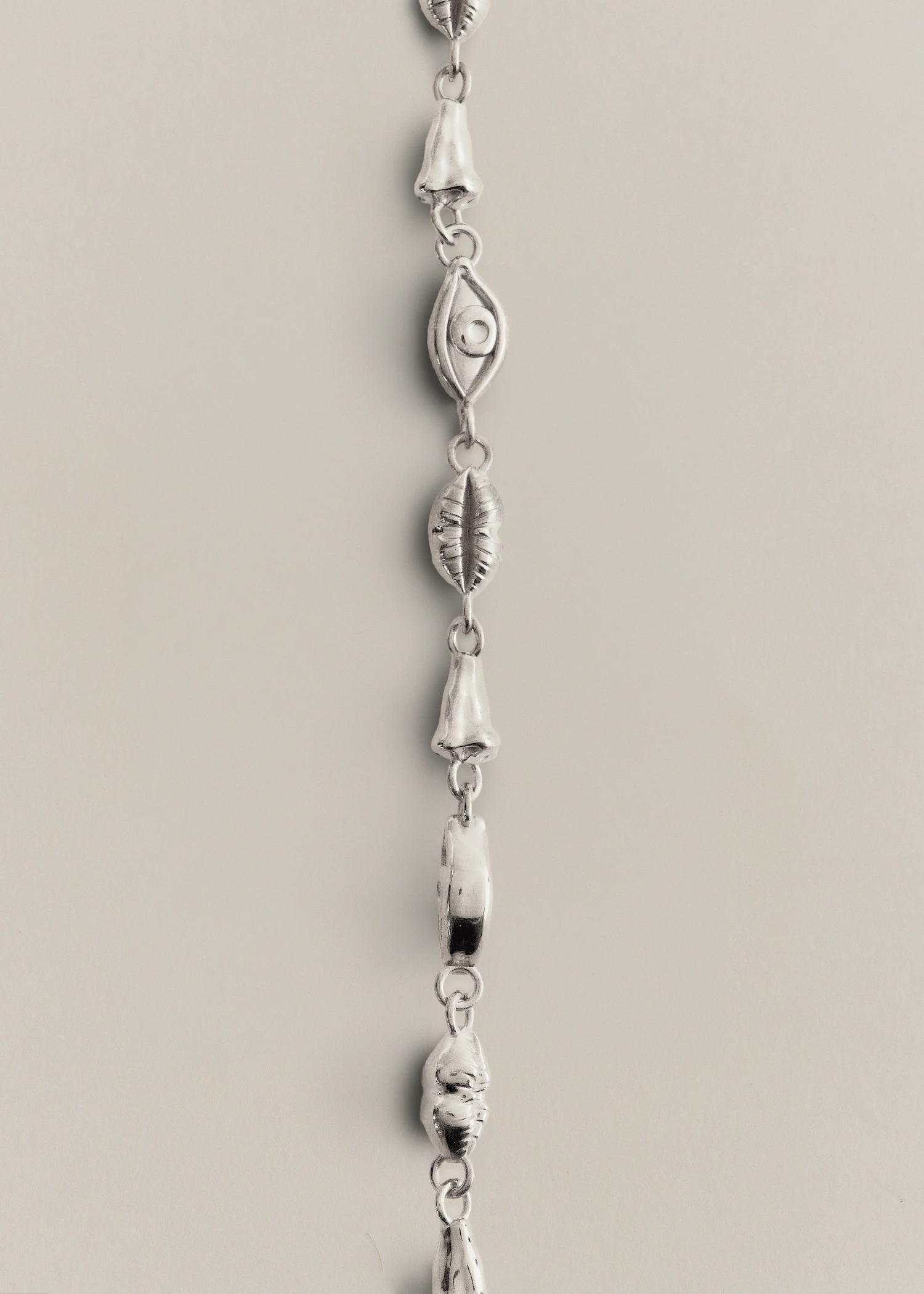 Sama Maxi Bracelet features a series of pendants arranged to form a face motif. Crafted in recycled sterling silver.